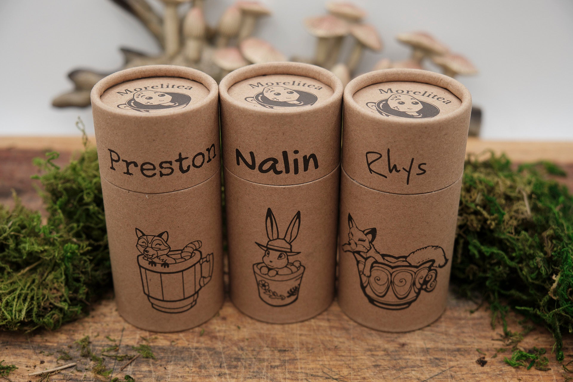Discover Cove City with this magical tea sample pack featuring Nalin, Rhys, and Preston—three distinctive blends ranging from a smokey bourbon barrel English Breakfast, to a bright and warming caffeine-free rooibos with ginger and citrus, and a nutty, floral Genmaicha with pistachio.. Each pack includes an exclusive character card (can be any of our 15+ critters form Mycorzha), making every order a delightful blend of flavor and fantasy.